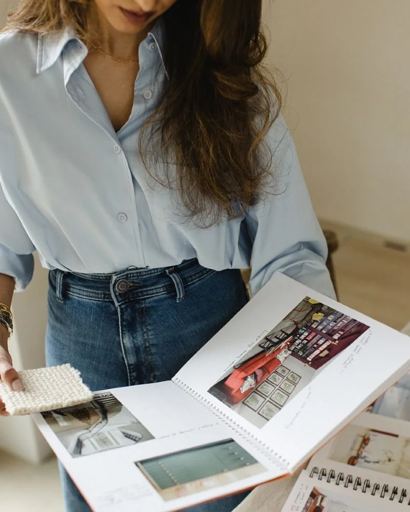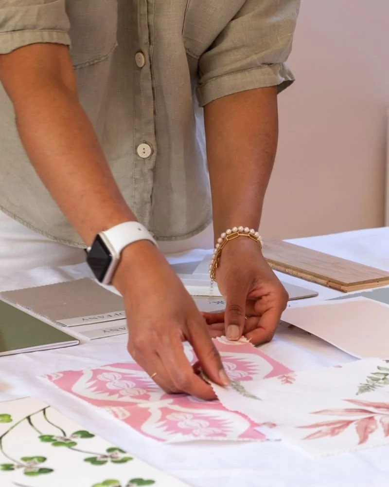 Examples: Abigail sourcing materials from one of her 400+ suppliers, working on a client project, or assembling a room design.